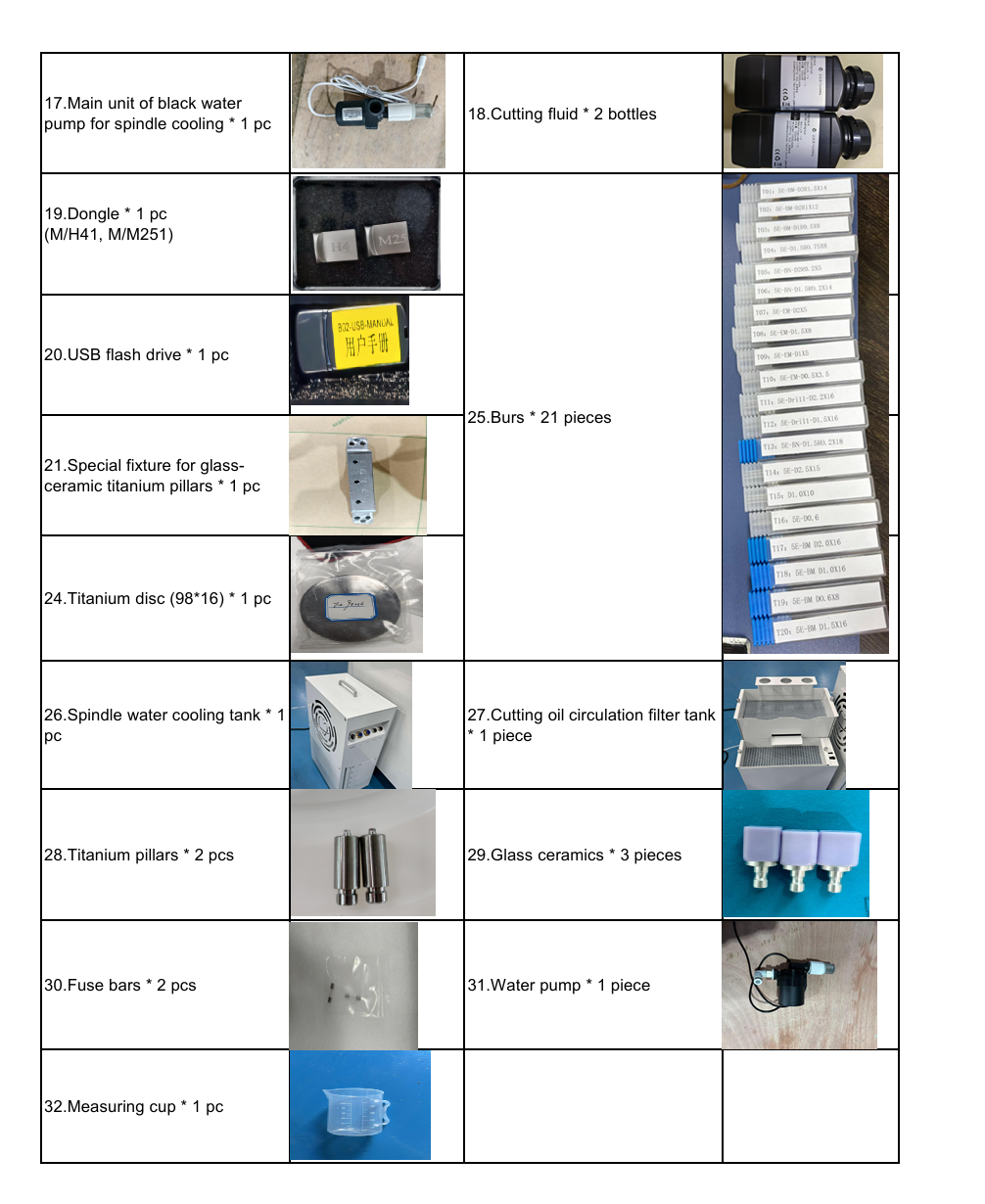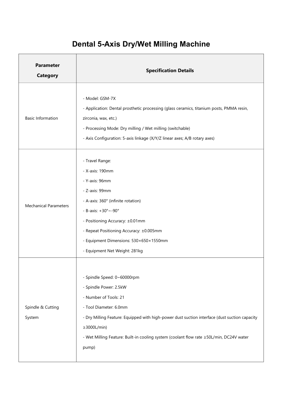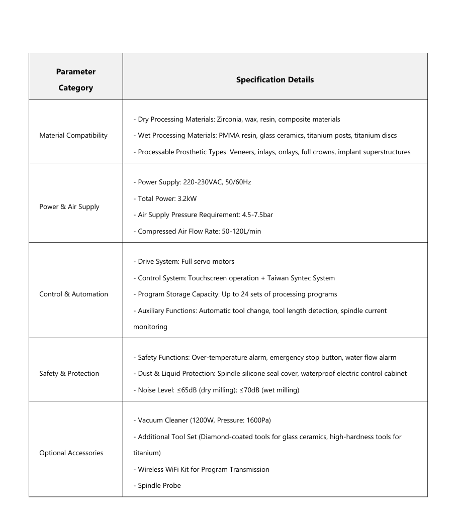 Application: Dental prosthetic processing (glass ceramics, titanium posts, PMMA resin, zirconia, wax, etc.)