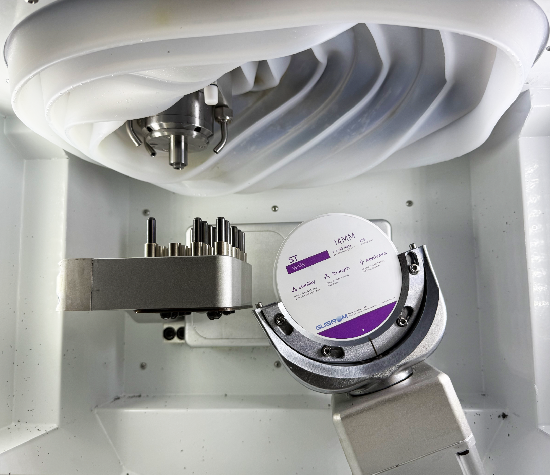 Wet Processing Materials: PMMA resin, glass ceramics, titanium posts, titanium discs