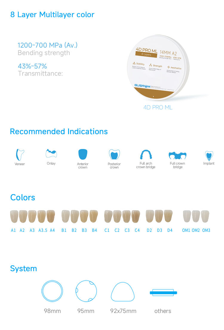 Innovative 4D Technology: 4D PRO ML zirconia disc is superposed by 8 layers and gradient with 15 layers. The multilayer color is used by innovative 4D technology, to achieve the effect of lifelike dental restorations. 4D PRO ML is a reformed zirconia material for CAD/CAM dental workflow, providing zirconia milling stability and structure stability.