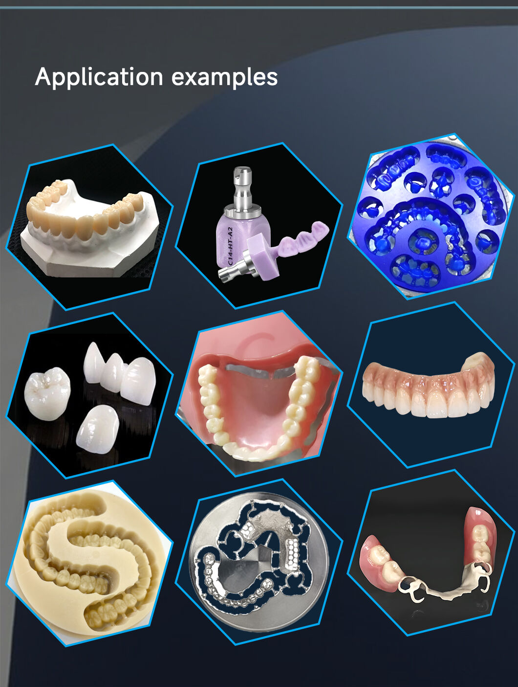 5 axis 5 linkage and large-angle processing expand the capability of milling various dental restorations, such as onlay, inlay, crown, etc.