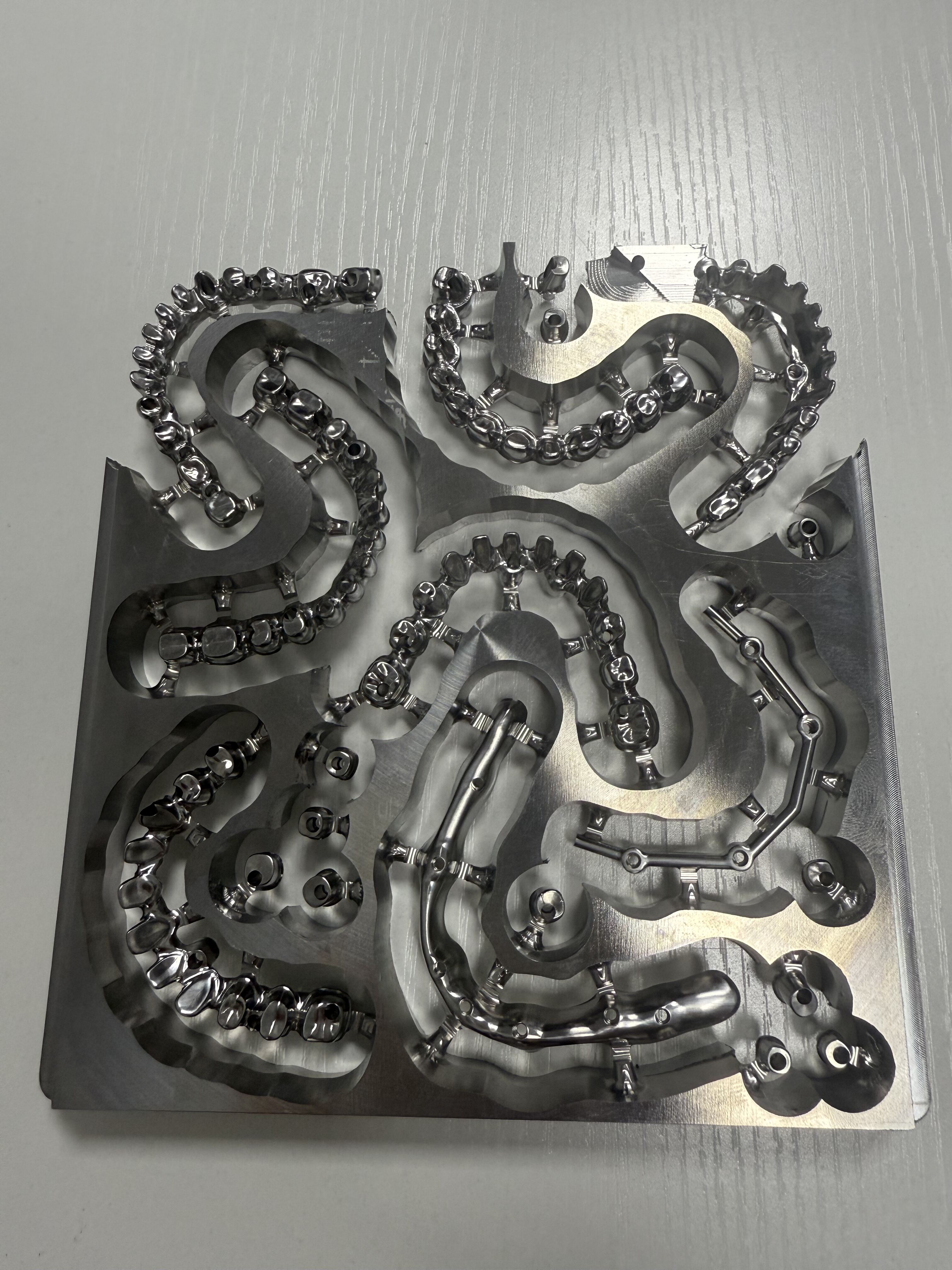 The dedicated fixture accommodates large 140×150mm square plates, milling 8+ bridges per block. Material utilization is improved by over 30% compared with traditional circular plates, greatly reducing material waste.