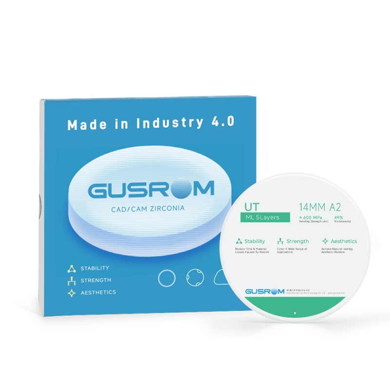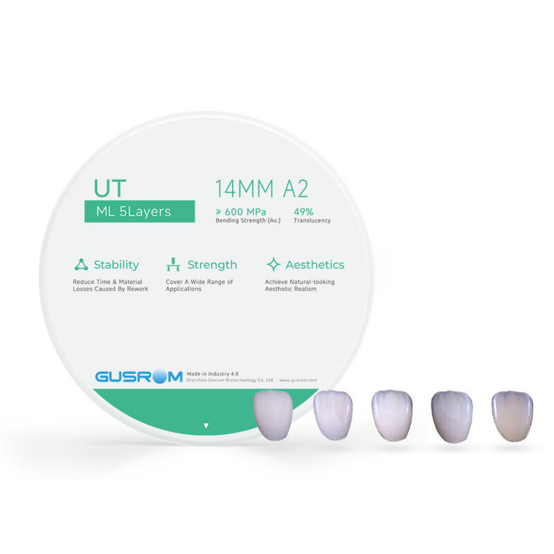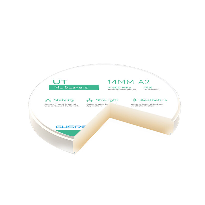 5-layer stacked structure with 9-level gradient transition: UT ML zirconia disc engages the fabricating of many types of restorations for the most natural results, such as veneer, onlay, etc.